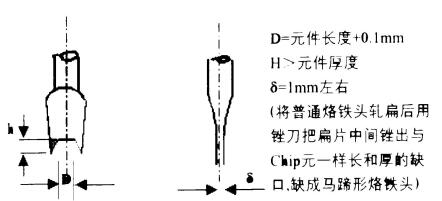 (2)用與器件尺寸相匹配雙片扁鏟式馬蹄形烙鐵頭(可自制或采購(gòu),見(jiàn)圖12-3)同時(shí)加熱器件兩端所有引腳焊點(diǎn)。