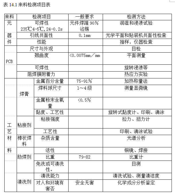 由于一般中、小企業(yè)都不具備材料的檢測手段,因此對于焊膏、貼片膠、棒狀焊料、焊劑、清洗劑等表面組裝材料一般不作檢驗,主要靠對焊膏、貼片膠等材料料生產(chǎn)廠家的質(zhì)量認(rèn)證體系的鑒定,并固定進貨渠道,定點采購。進貨后主要檢查產(chǎn)品的包裝、型號、生產(chǎn)廠家、生產(chǎn)日期和有效使用期是否符號要求,檢查外觀、顏色、氣味等方面是否正常,另外,在使用過程中觀察使用效果,例如對焊膏,主要觀察印刷性和觸變性是否良好,室溫下使用時間的長短,焊后的焊點表面形;吠、浸潤性,以及錫球和殘留物的多少等,發(fā)現(xiàn)問題應(yīng)及時與供應(yīng)商進行聯(lián)系解決。