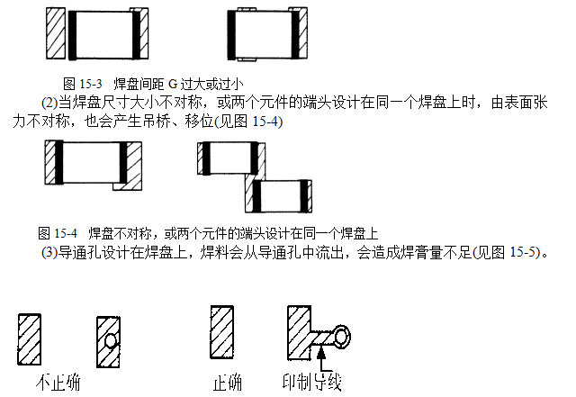 (1)當(dāng)焊盤間距G過大或過小時,回流焊時由于元件焊端不能與焊盤搭接交疊,會產(chǎn)生吊橋、移位(見15-3)。