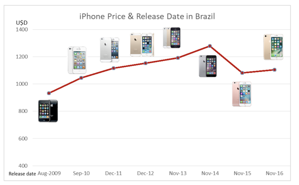 但是,富士康的出現(xiàn)并沒(méi)讓蘋果產(chǎn)品的價(jià)格下降。iPhone 6 發(fā)售時(shí),在巴西的售價(jià)比美國(guó)售價(jià)高了 97%。甚至,連按時(shí)發(fā)售都做不到。巴西消費(fèi)者見(jiàn)到 iPhone 4S 時(shí),已經(jīng)比全球發(fā)售時(shí)間推遲了至少兩個(gè)月。